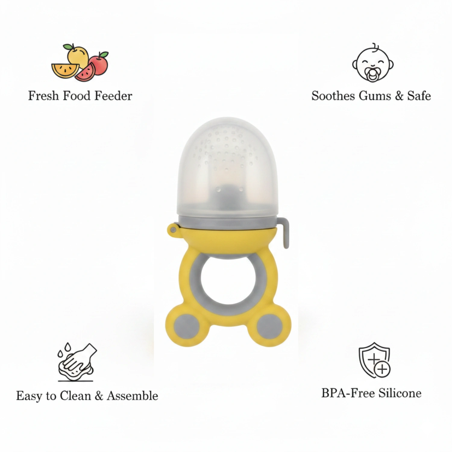 - Dual-purpose design: fruit feeder + teething pacifier